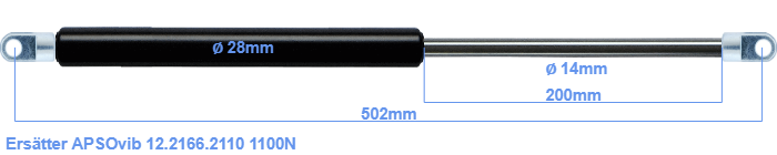 Ersättningsgasfjäder för APSOvib 12.2166.2110 1100 Newton. Öglan har en tjocklek på 10mm och håldiameter på 10.1mm Fabrikat: Hahn.