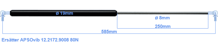 Ersättningsgasfjäder för APSOvib 12.2172.9008 80 Newton. Kulpannan passar (redan presenterat) kula med diameter 10mm. En tillhörande kultapp gänga inkluderad. Fabrikat: Hahn.