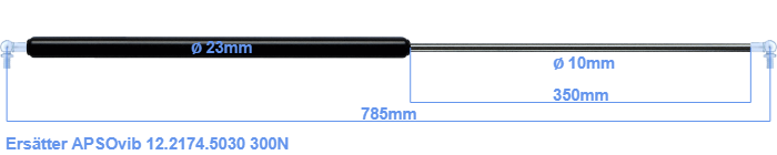 Ersättningsgasfjäder för APSOvib 12.2174.5030 300 Newton. Kulpannan passar (redan presenterat) kula med diameter 10mm. En tillhörande kultapp gänga inkluderad. Fabrikat: Hahn.