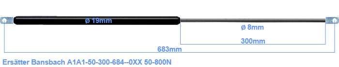 Ersättningsgasfjäder för Bansbach A1A1-50-300-684--0XX 50-800 Newton. Öglan har en tjocklek på 10mm och håldiameter på 8.1mm Fabrikat: Hahn.