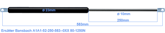 Ersättningsgasfjäder för Bansbach A1A1-52-250-583--0XX 80-1250 Newton. Öglan har en tjocklek på 10mm och håldiameter på 8.1mm Fabrikat: Hahn.