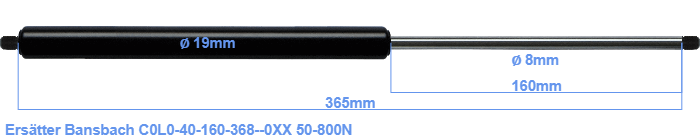 Ersättningsgasfjäder för Bansbach C0L0-40-160-368--0XX 50-800 Newton. Gänga: M8. Fabrikat: Hahn.