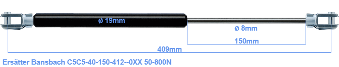 Ersättningsgasfjäder för Bansbach C5C5-40-150-412--0XX 50-800 Newton. Gaffeln har en håldiameter på 8.1mm Fabrikat: Hahn.