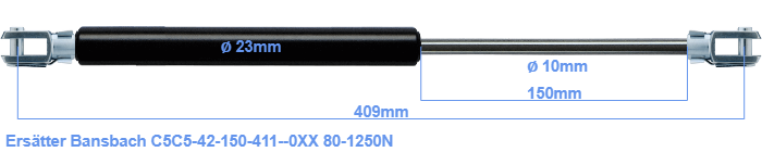 Ersättningsgasfjäder för Bansbach C5C5-42-150-411--0XX 80-1250 Newton. Gaffeln har en håldiameter på 8.1mm Fabrikat: Hahn.
