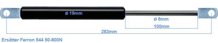 Ersättningsgasfjäder för Ferron 544 50-800 Newton. Öglan har en tjocklek på 10mm och håldiameter på 8.1mm Fabrikat: Hahn.