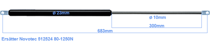 Ersättningsgasfjäder för Novotec 512524 80-1250 Newton. Öglan har en tjocklek på 10mm och håldiameter på 8.1mm Fabrikat: Hahn.