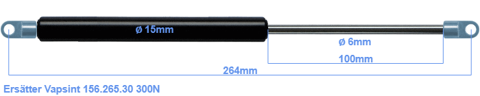 Ersättningsgasfjäder för Vapsint 156.265.30 300 Newton. Öglan har en tjocklek på 3mm och håldiameter på 6.1mm Fabrikat: Hahn.