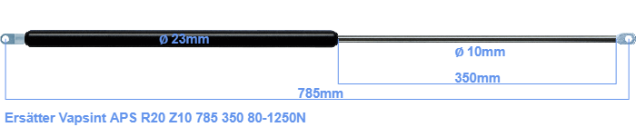 Ersättningsgasfjäder för Vapsint APS R20 Z10 785 350 80-1250 Newton. Fäste cylinder: Öglan har en tjocklek på 5mm och håldiameter på 8.1mm Fäste kolvstång: Öglan har en tjocklek på 10mm och håldiameter på 8.1mm Fabrikat: Hahn.